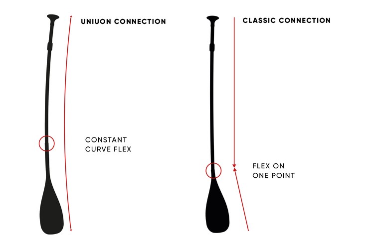 In der Vergangenheit haben sich die Flex-Kurven von Paddeln aus zwei Bereichen zusammengesetzt: Blade und Schaft. Diese sind durch ein übergrosses, steifes Verbindungsstück miteinander verbunden. Das Fanatic Union Paddel wurde, durch das Flexverhalten teilbarer Paddel, revolutioniert. Denn der Flex verläuft jetzt harmonisch von der Bladespitze bis zum Schaft. Das Verbindungsstück sitzt nun weiter oben am Schaft. Dies führt zu einem konstanteren Flex, einer einzigartigen Federkraft und erhöhter Reaktionsfreudigkeit. Und dies mit jedem Paddelzug. Von der Sekunde an, in der das Paddel das Wasser berührt, wird jede Energie sofort in eine Vorwärtsbewegung umgewandelt.